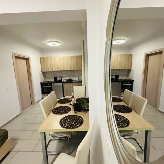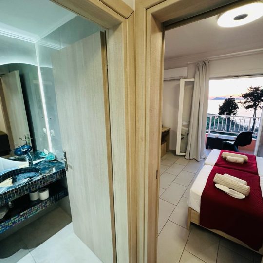The holiday apartment Nikos with sea view and designed for 5 persons, is located on the 1st floor and therefore also offers a fantastic sea view from the furnished balcony. This apartment also has 2 separate bedrooms, one with a double bed and the other one with 2 single beds and a sofa bed. There is also a large well-equipped kitchen with a dining area and a bathroom with shower.