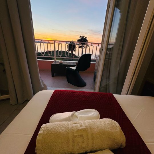Outside: Large, roofed and furnished balcony with wooden table and bences and fantastic sea views on the upper floors. The superior apartment on the ground floor has a sea-side seating area outside in the garden. For general use: Car parking spaces, free access to the outdoor pool in the accommodation on the opposite side of the street.