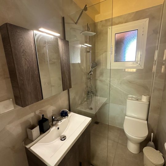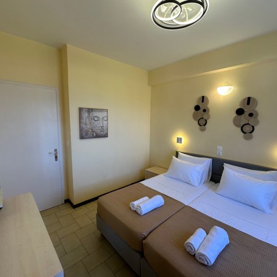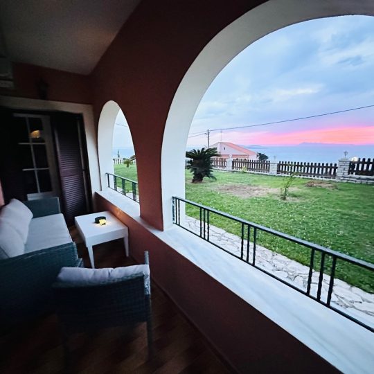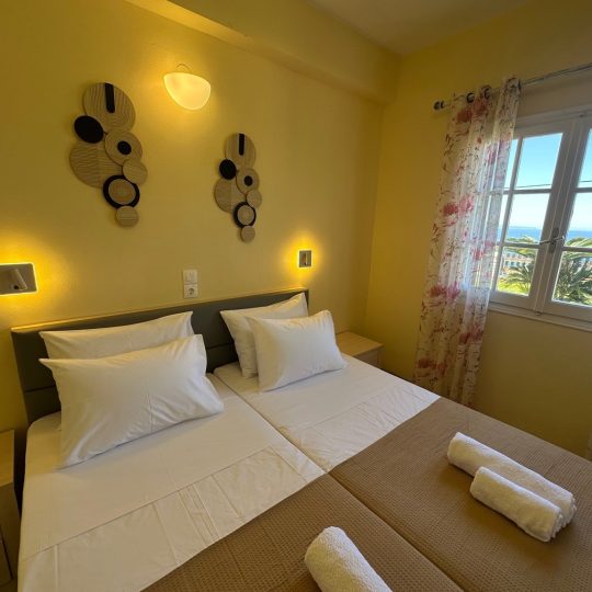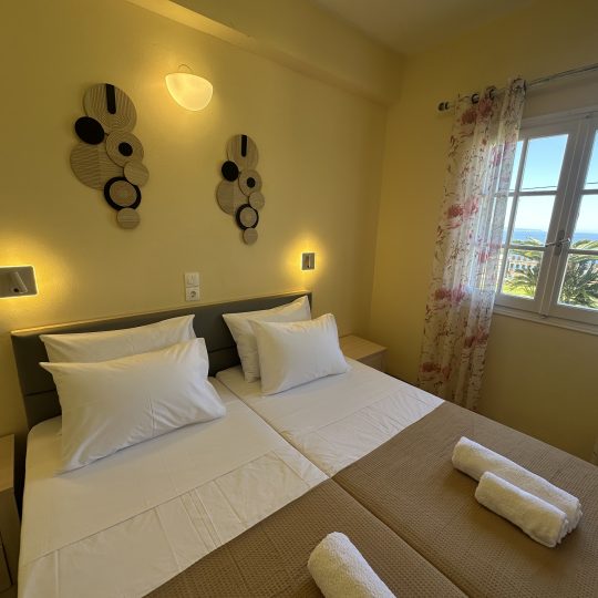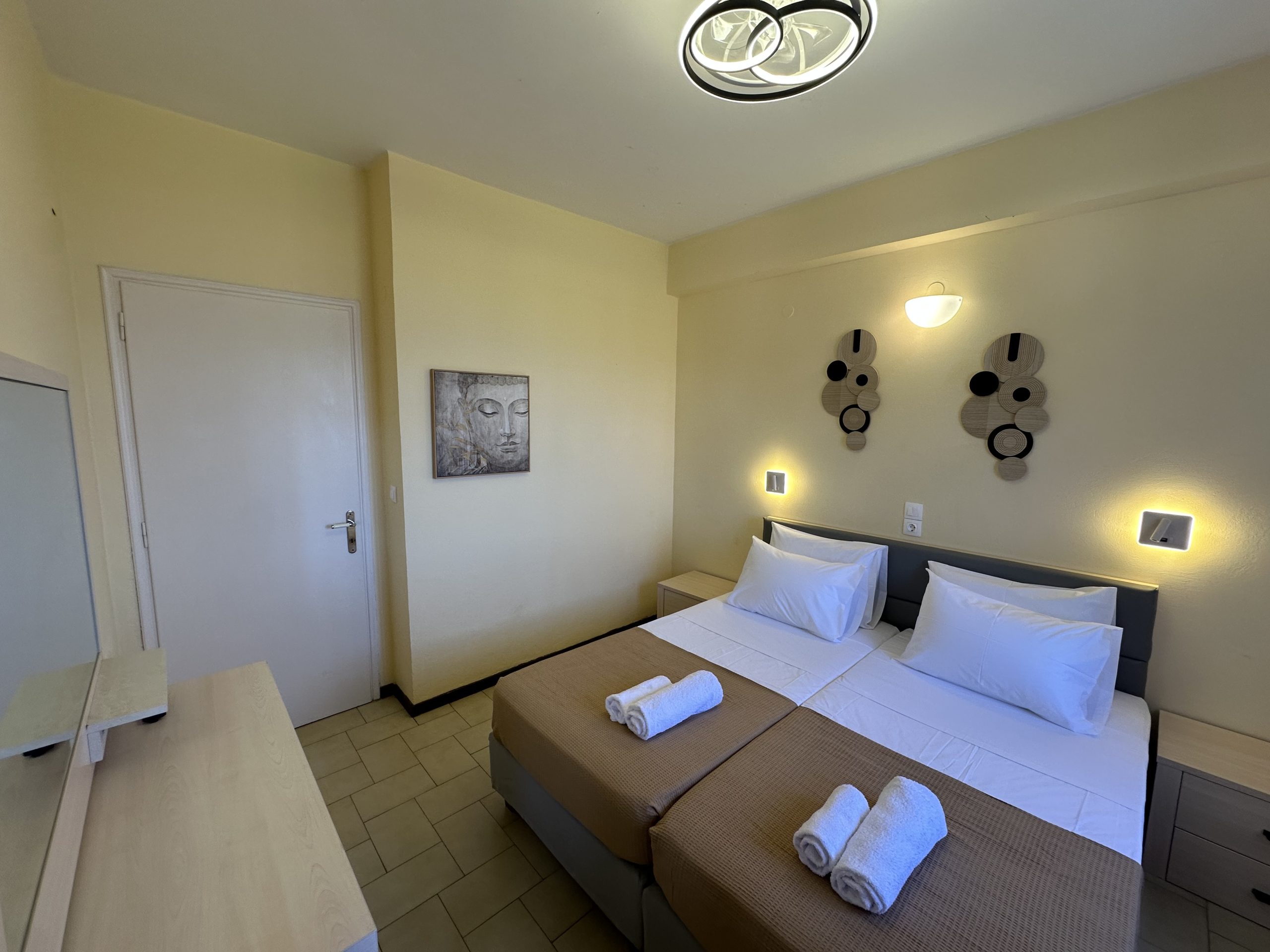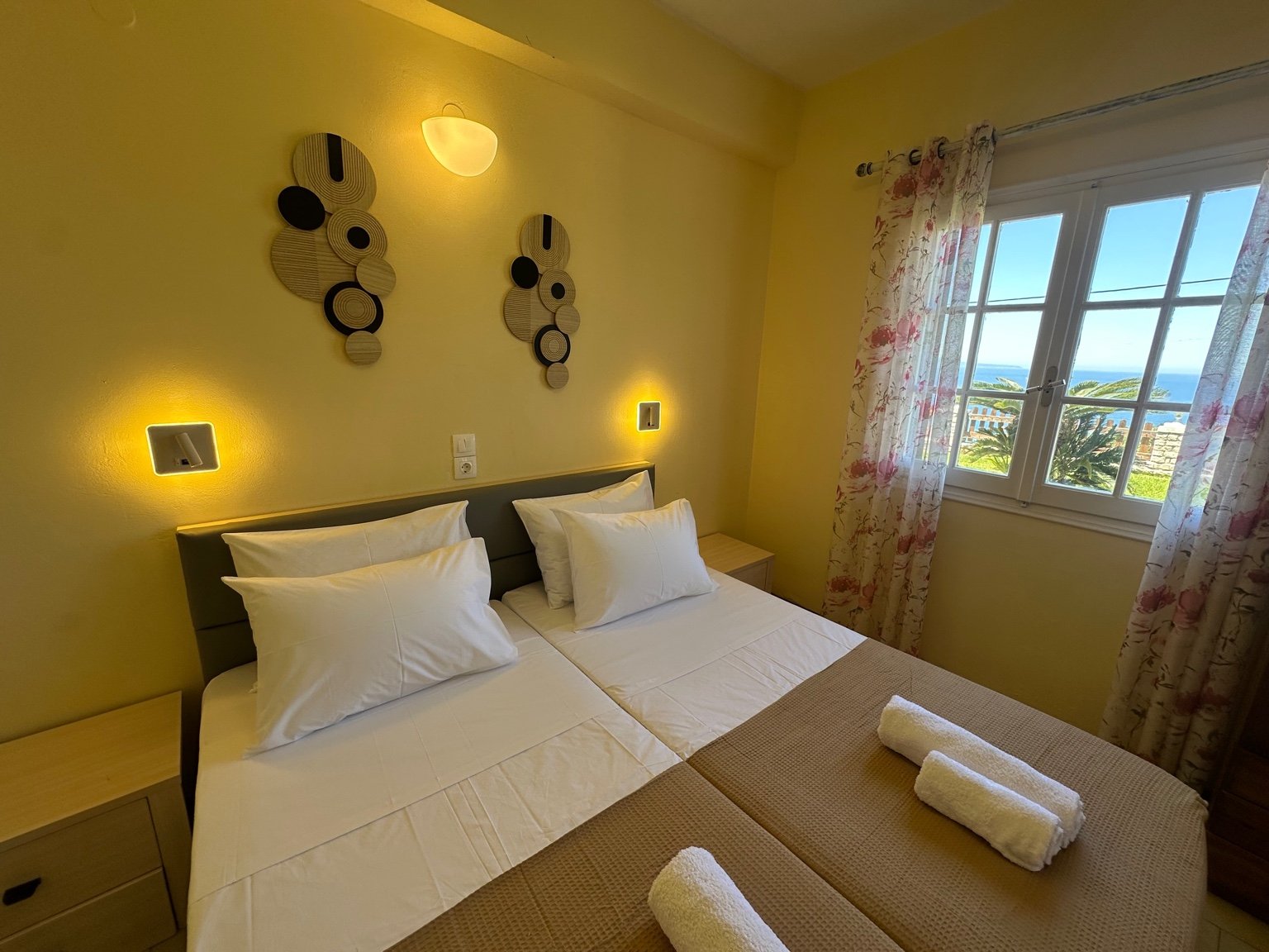 The holiday apartment Nikos with sea view and designed for 5 persons, is located on the 1st floor and therefore also offers a fantastic sea view from the furnished balcony. This apartment also has 2 separate bedrooms, one with a double bed and the other one with 2 single beds and a sofa bed. There is also a large well-equipped kitchen with a dining area and a bathroom with shower.