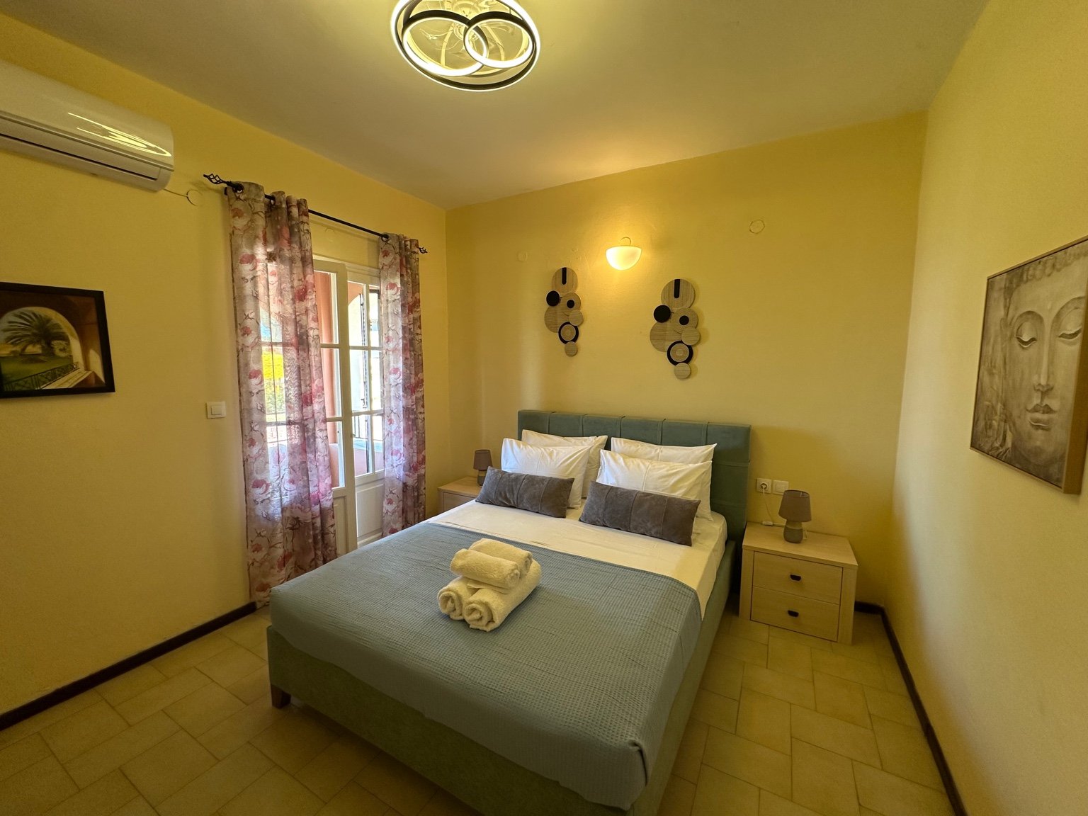 2 Bedrooms: Two separate bedrooms, either both with double beds or one with a double bed and one with 2 single beds (which can be combined to form a double bed) and a sofa bed. Each bedroom has 2 bedside tables and 2 reading lamps, a wardrobe, a stool, a table with mirror, access to the terrace or balcony with sea view (upstairs), air conditioning and cable TV. If required, extra beds for toddlers or babies can be provided free of charge.